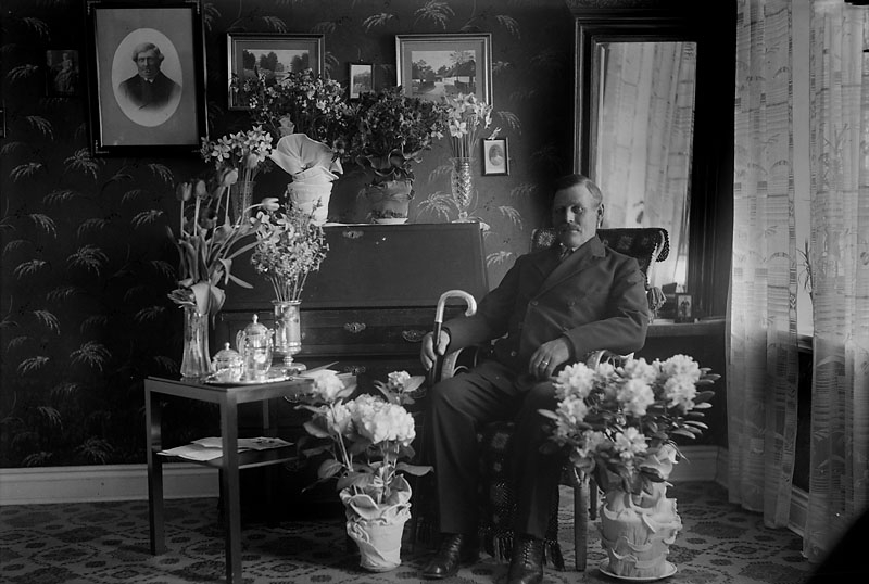 Fiskare Karlsson, man omgiver av blommor uppvaktning i hemmet