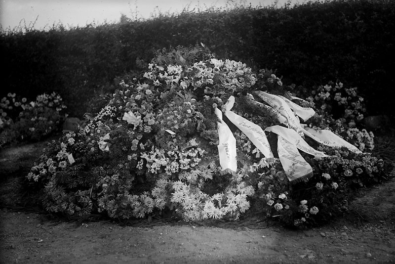 Fru Jönssons grav, gran med kransar och blommor