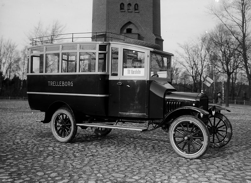 Omnibus det står Trelleborg och Korsholm på bussen, byggnad i bakgrunden