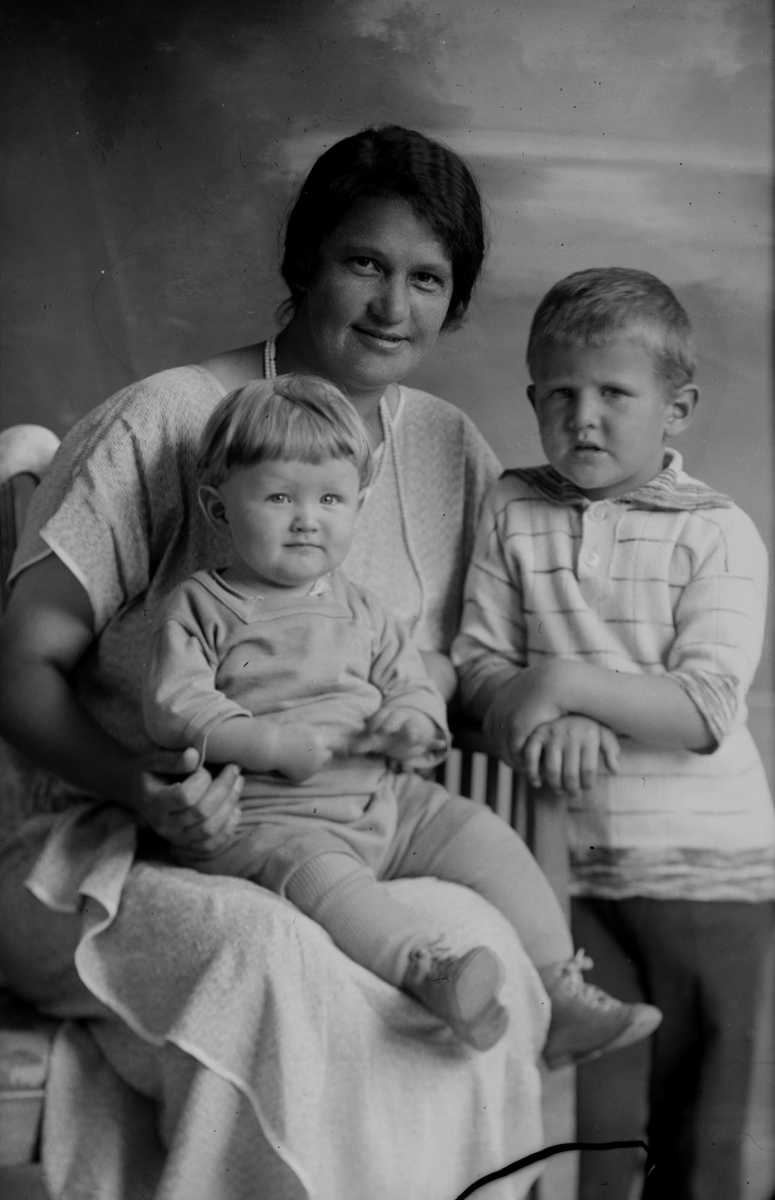 Kvina och två barn porträtt, emulsions avlossning, metallutfällning.