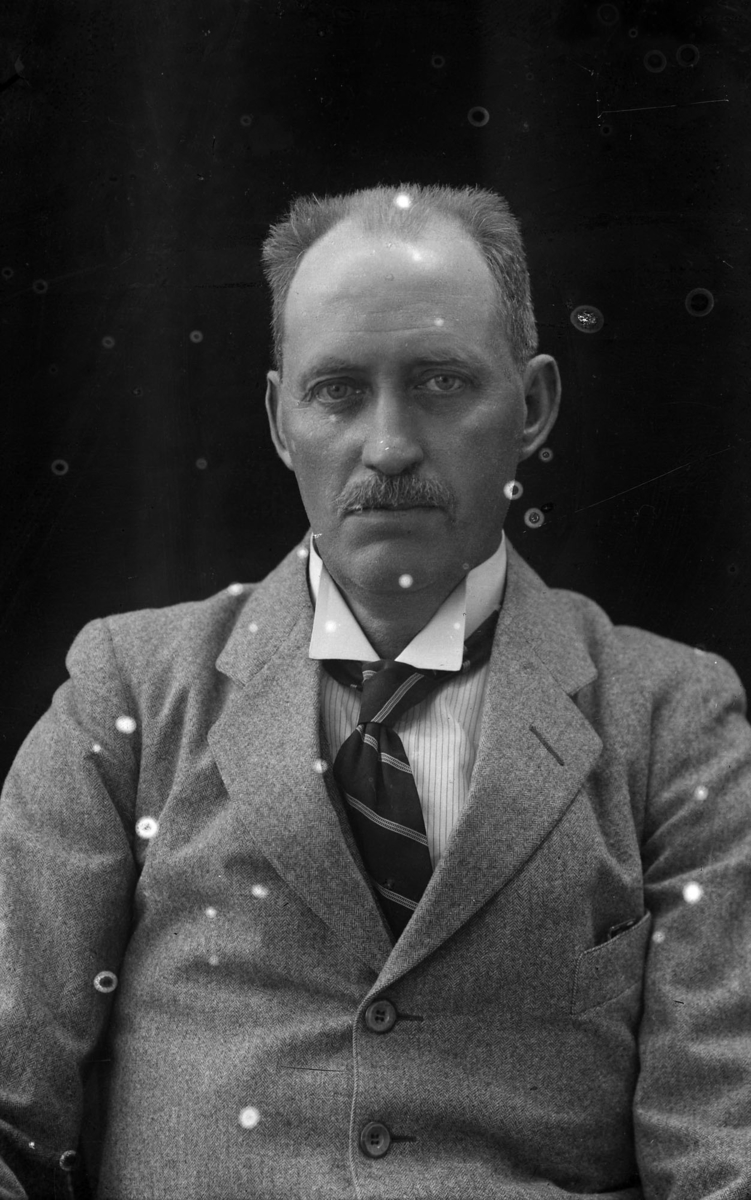 Man, år 1925 passfoto metallutfällning, fläckar.