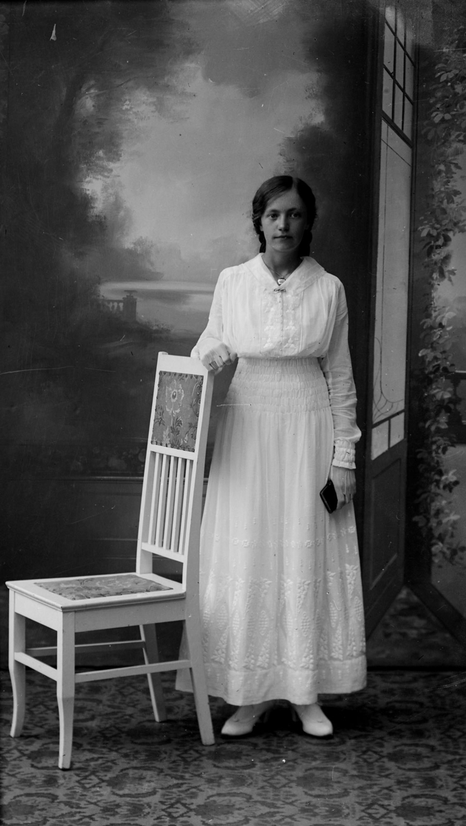 Ateljébild, kvinna, en konfirmand 1915, metallutfällning.