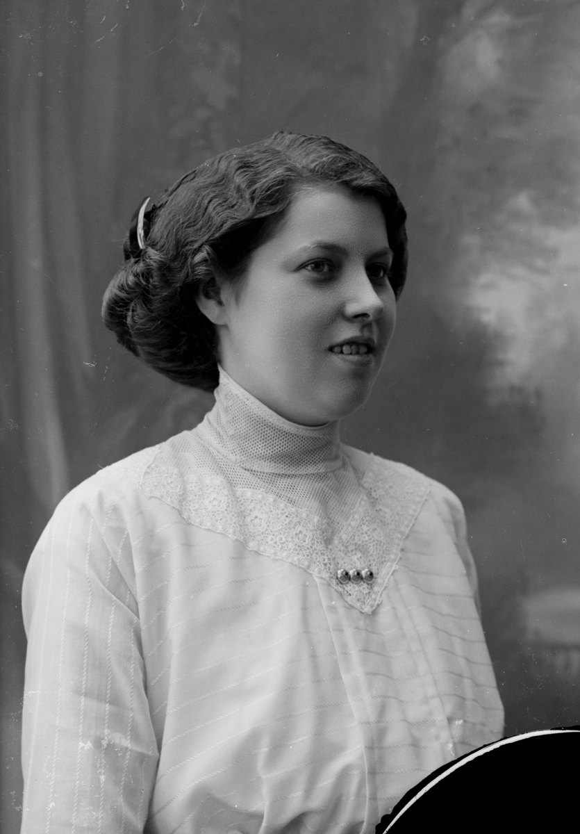 Ateljébild, kvinna fröken Stina Francke metallutfällning, hörn trassigt.