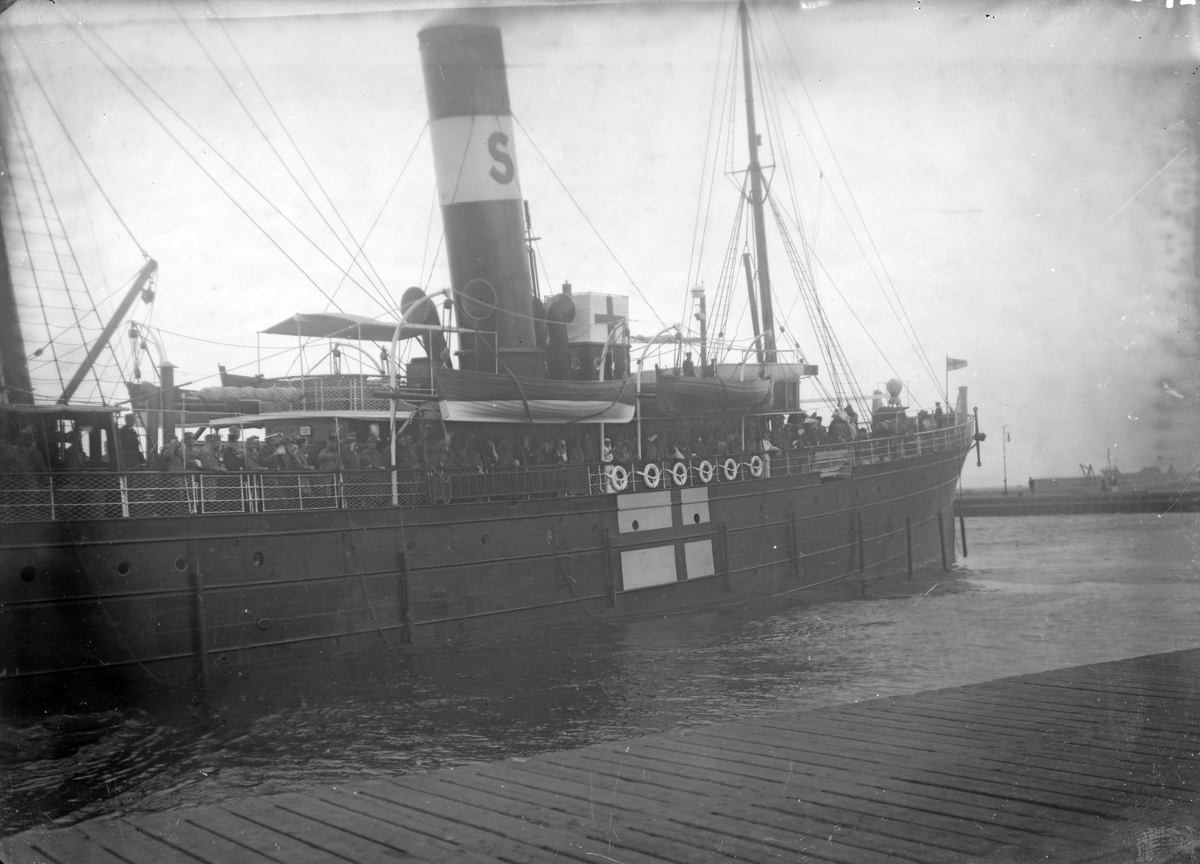 Titel: Krigsfångeutväxling under första världskriget. Fartyg med soldater i Trelleborgs hamn.
