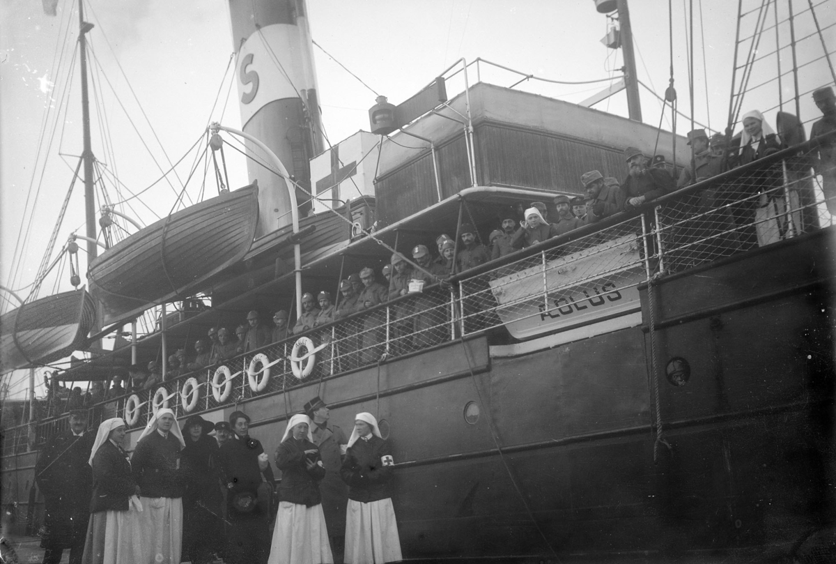 Krigsfångeutväxling under första världskriget. Soldater på Sveabolagets ångare AEOLUS. Sjuksköterskor står på kajen.