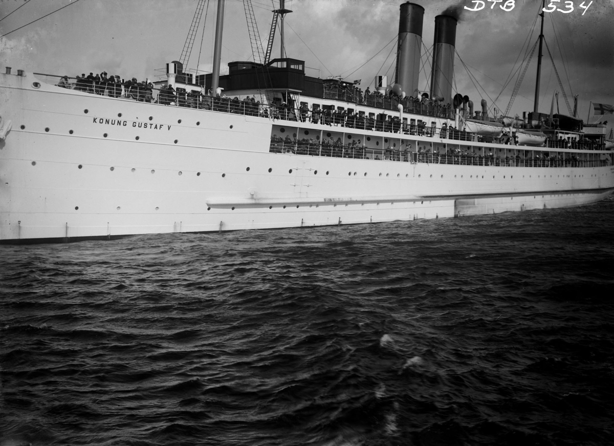 Färjan sett från Allehanda, många människor som vinkar. Konungen Gustav V..