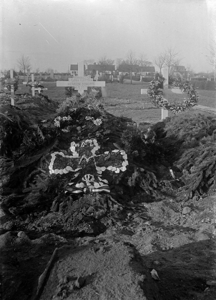 Invalidutväxlingen under första världskriget år 1915-1917. Gravar på Norra kyrkogården täckta med blommor.