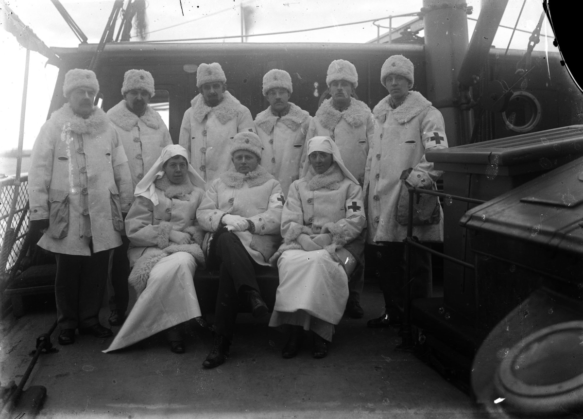 Röda korset, 1914-1918 Män och kvinnor i rödakorsuniform på ett båtdäck.