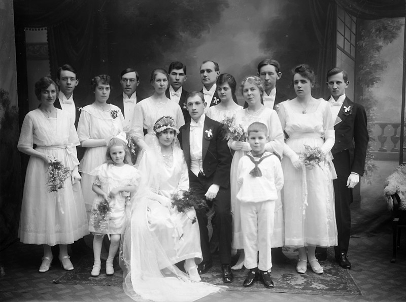 Ateljébild. Brudpar med anhöriga. Brudparet heter Algot och Gunhild Weige. Den lilla tärnan vid brudens sida heter Ylwa Höijer, gossen vid brudgummens sida heter Birger Gullberg. Rakt bakom honom står Signe Norman.