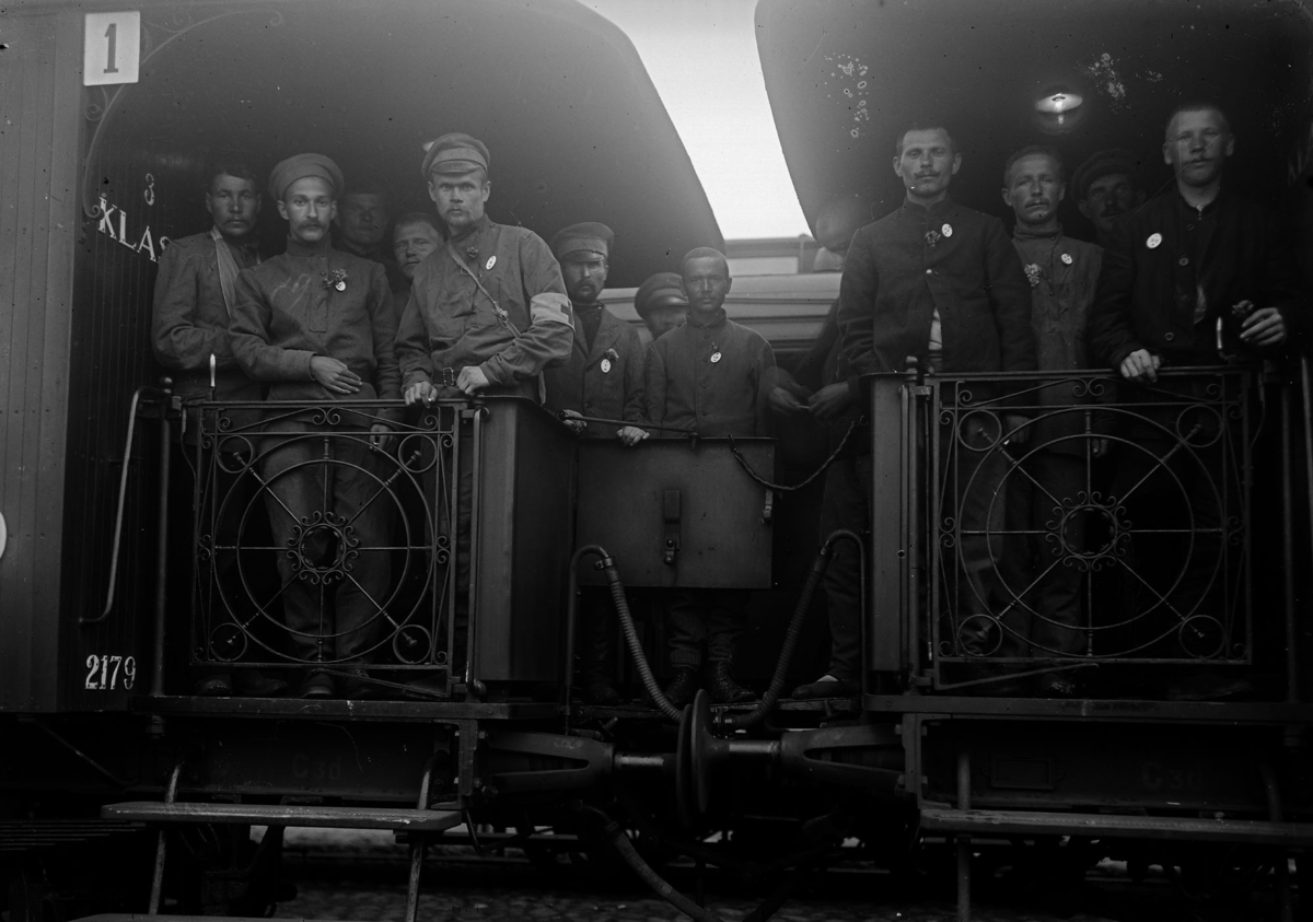 Invalidutväxlingen under första världskriget år1915-1917. Soldater i järnvägsvagnar.