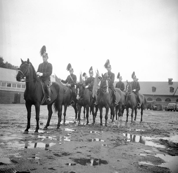 Fanfartrumpetare på kaserngården. Uniform m/ä.