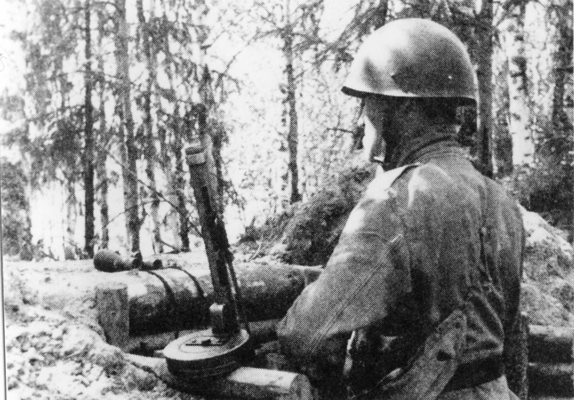 Finlandsfrivillig, med kpist och kikare till hands, bevakar.