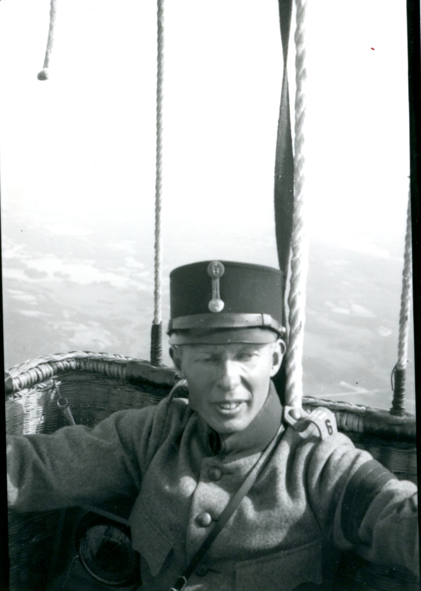 Kulballong m/1930 i luften. Furir Suneson i ballongkorg.