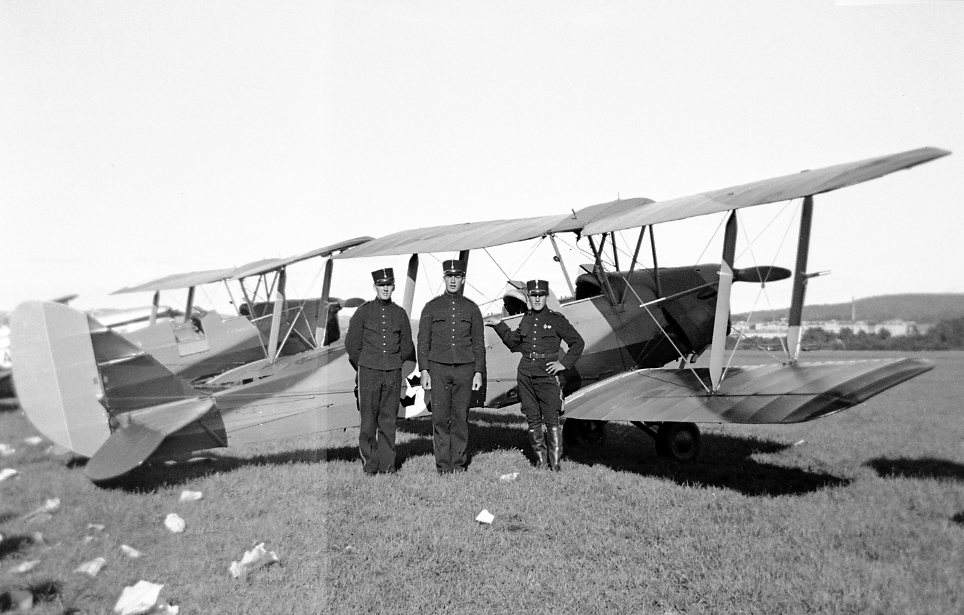 Militärt flygplan. Tre värnpliktiga i uniform m/ä.