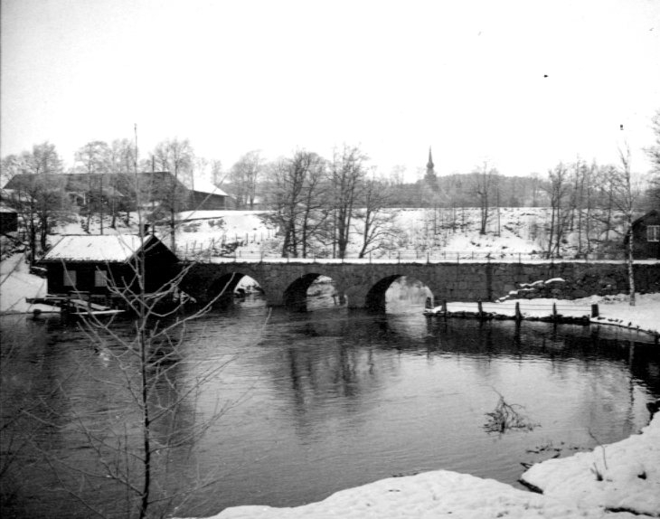 Titel: Bro över vattendrag. Bron är Vamme bro. Kyrktornet i bakgrunden tillhör Lerums kyrka.