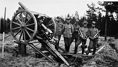Kanon m/1902. 7,5 cm, skjutning på bockar.
