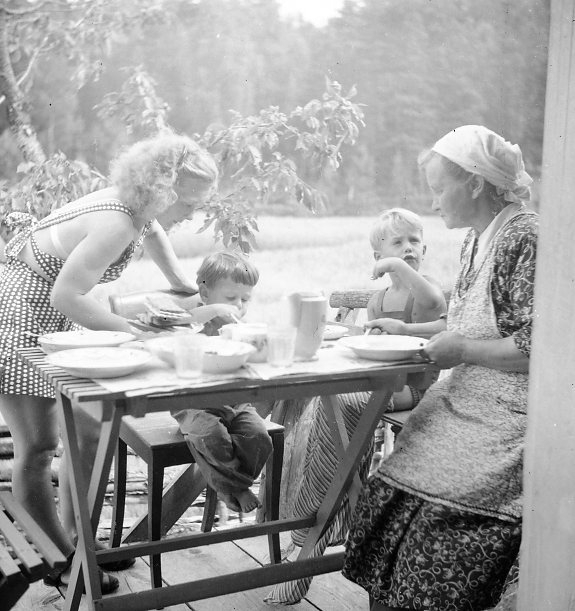 Kvinnor (2) och två barn som fikar i en trädgård.