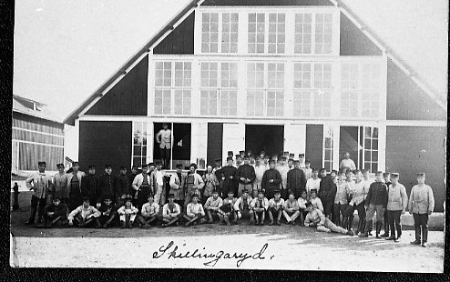 Soldater framför lägerhyddan, i Skillingaryd. Östra lägret.