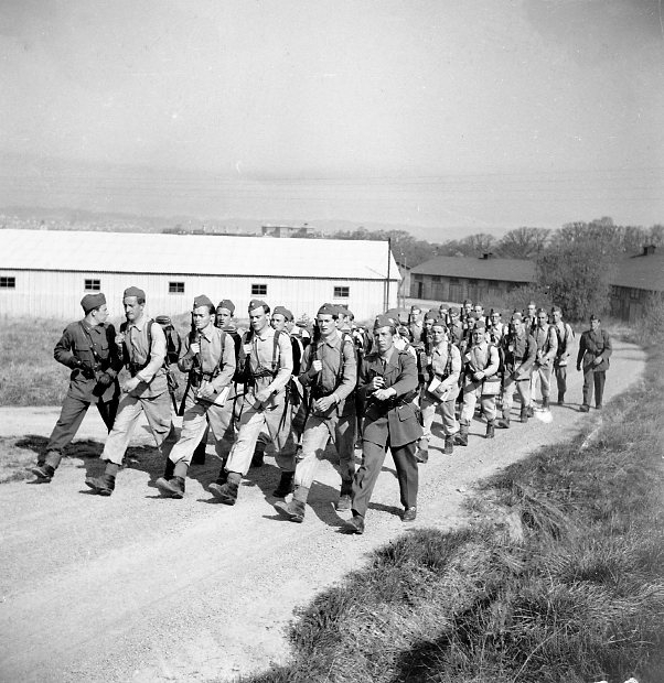 Marscherande trupp i Linnekläder. Karbin m/1894. Ränsel m/1905.
