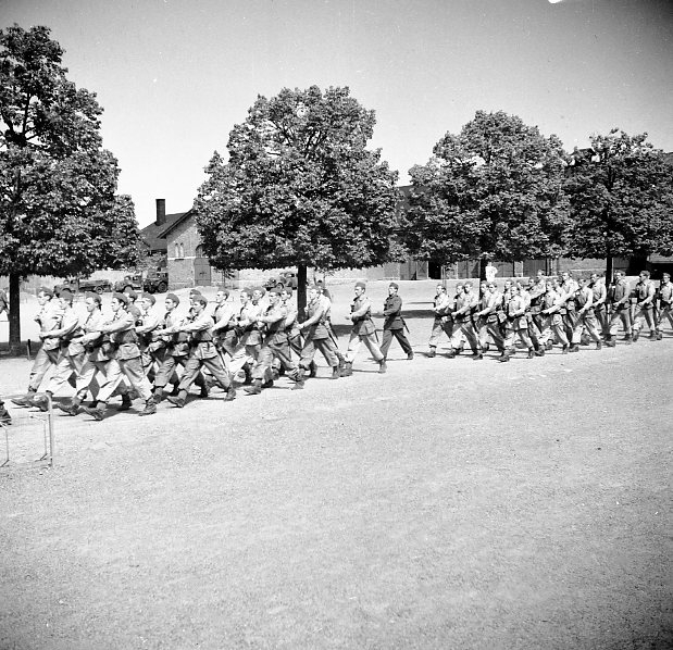Marscherande trupp i linnekläder på kaserngården.