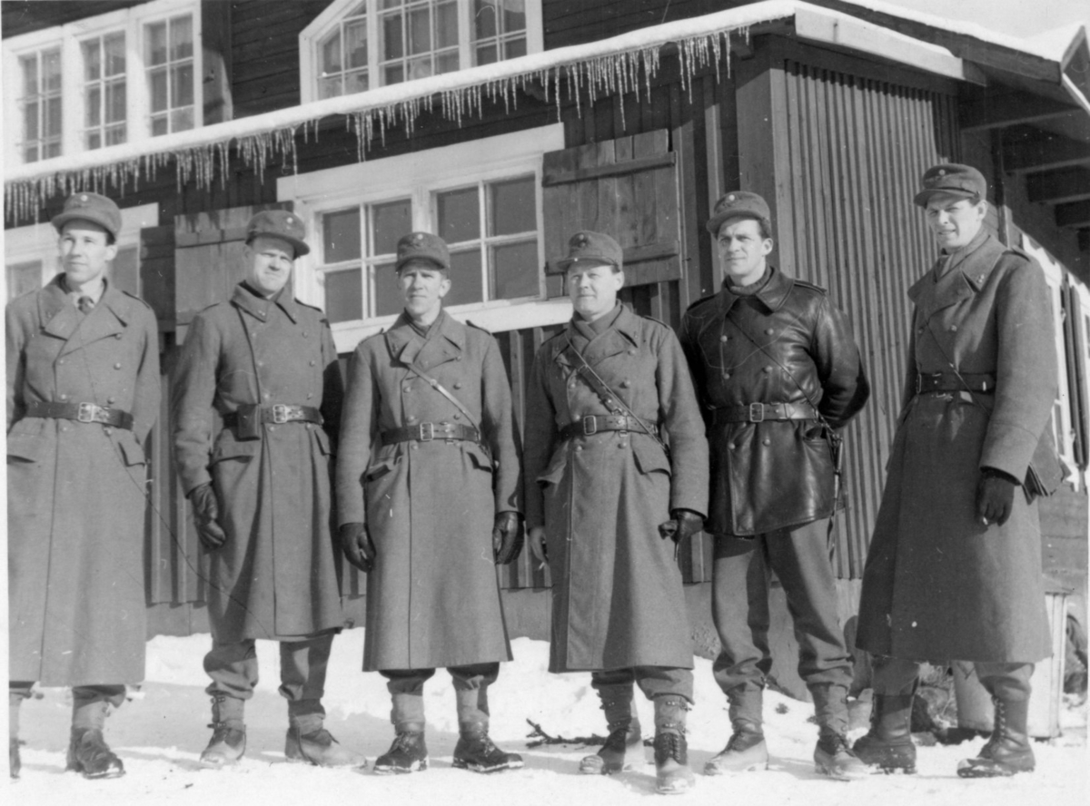 Underofficerare framför barack i Skillingaryd, A 6. Namn se notering.