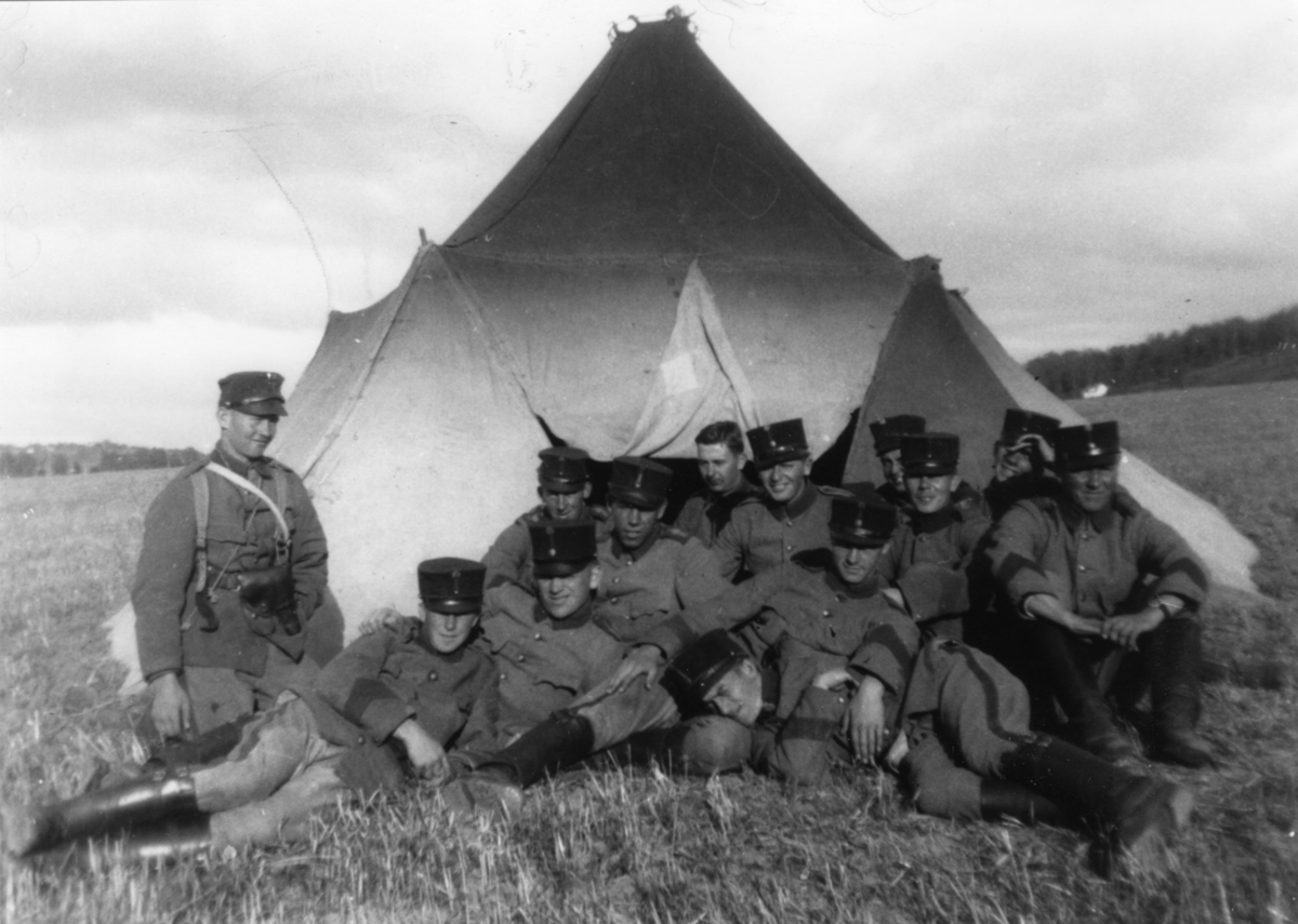 Bivack. Trupp framför tält, A 6. Ramsjöholm (Lyckås gård ?)