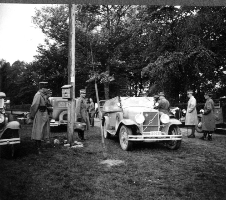 Fordon klara för avfärd. Tånga Hed. I mitten en Volvo PV 650 cabriolet, årsmodell 1929. Officerare, sannolikt ur A 2, i uniform m/1923 med trenchcoat.