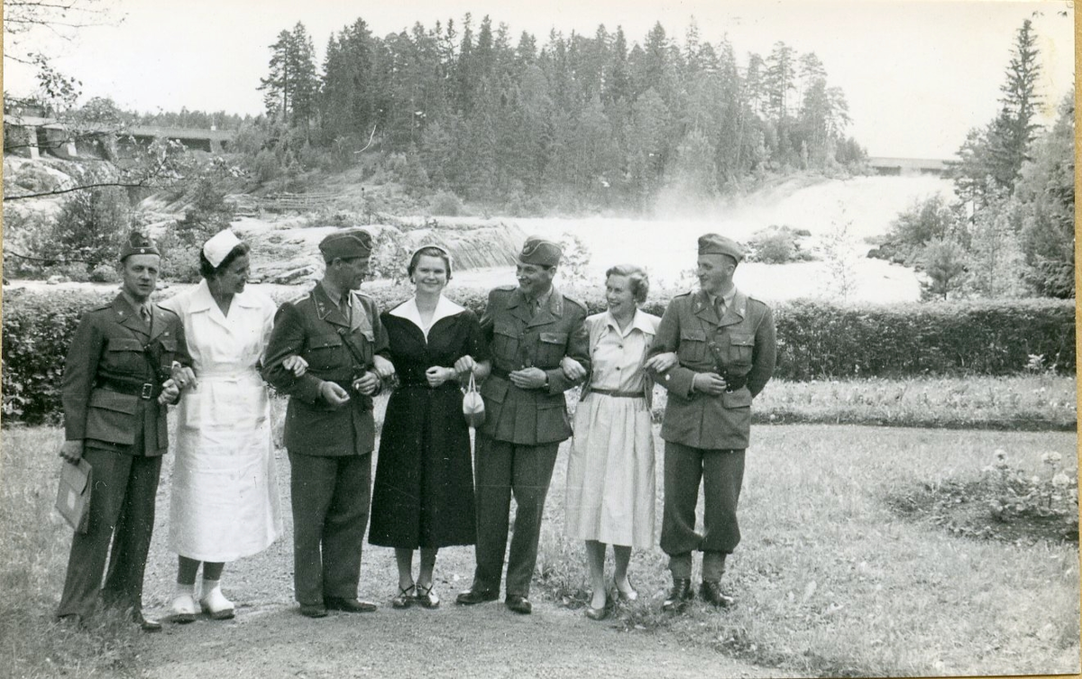 Samling framför officersmässen: Fr v kapten Tamm, fru Sjöberg, major Gordh, fröken Andersson, doktor Urwitz, fru Tamm, kadett Ström.