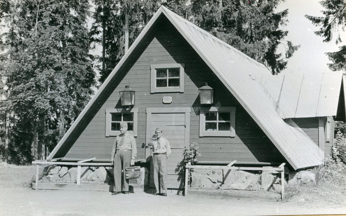 Löjtnant Lohréng och överfurir Krantz framför en av Laxöns äldsta byggnader, den så kallade Lägerhyddan, som uppfördes år 1882.
