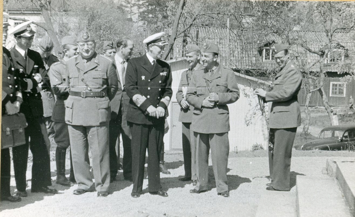 Överfurir Gambo har just sågat ned den sälgbuske som så när sprängt trappan och som han lovat inte skulle bort förrän det tidigare ruckliga sjukhuset snyggats upp. Här tillsammans med ingenjör Leopold, kapten Runvall och fanjunkare Edberg.