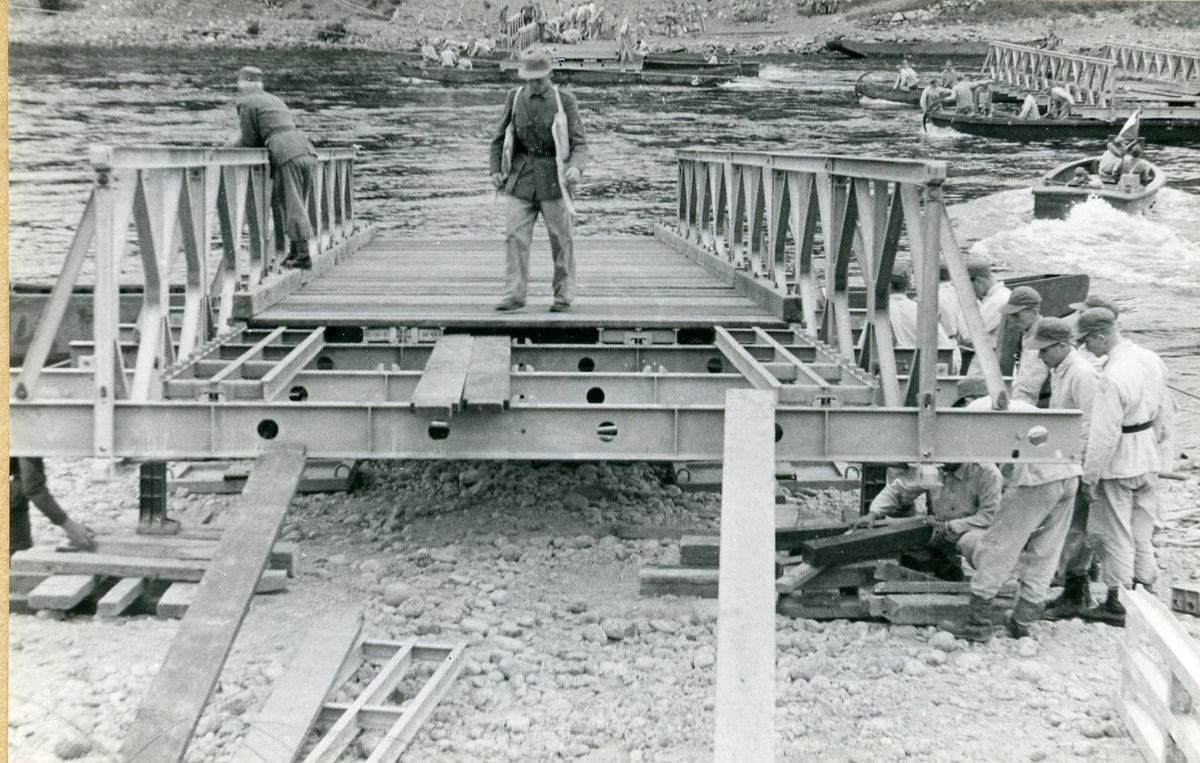 Full verksamhet vid Broslaget. Brodelar på båda stränderna och mitt i älven. Balkbro 2 flytande, "enkel-enkel".