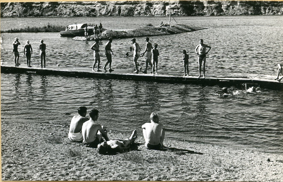 Titel: Badplatsen vid brobyggnadsplatsen Sand var mycket omtyckt den varma sommaren 1952.
