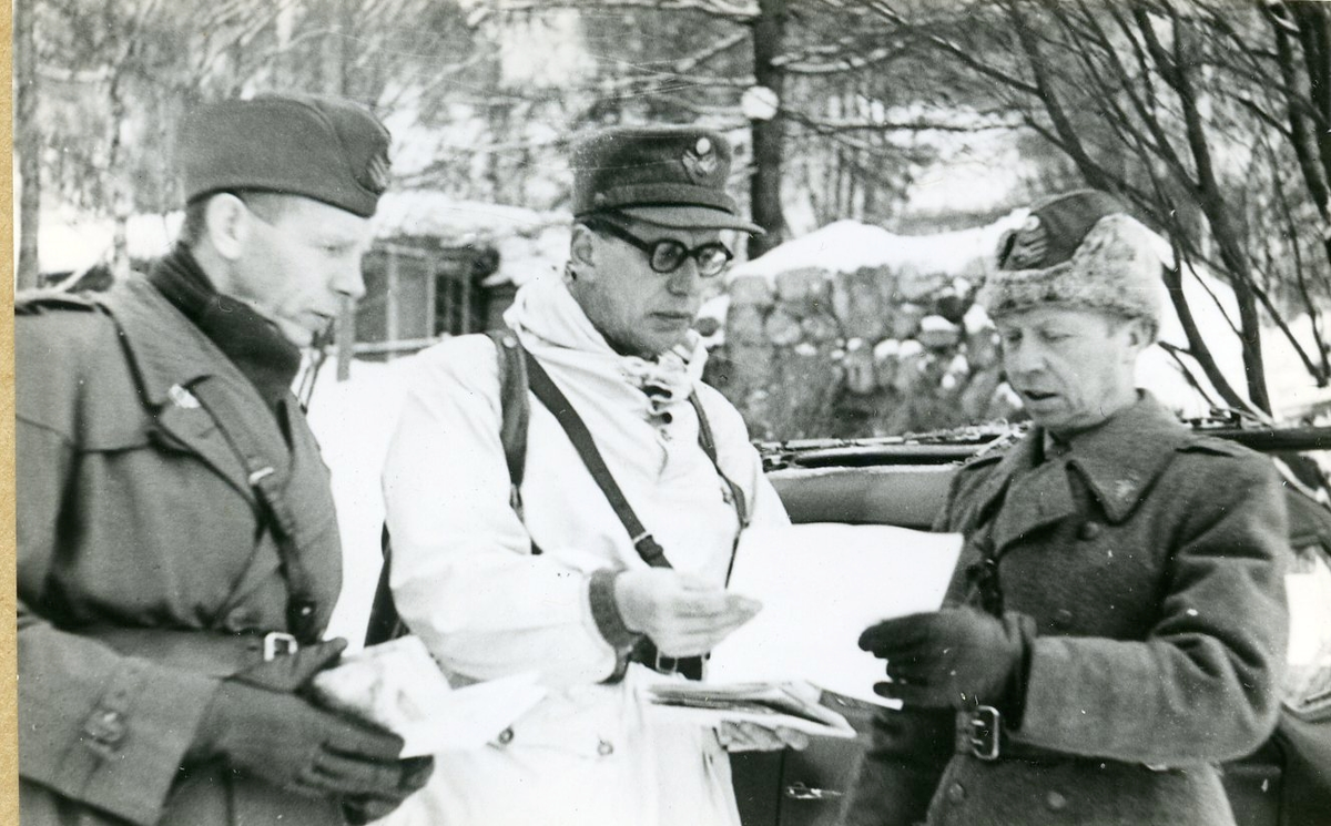 Vinterövning på Frösön. Kapten Hörlén, kapten Norberg och överste Dahlgren i diskussion om utbildningen.