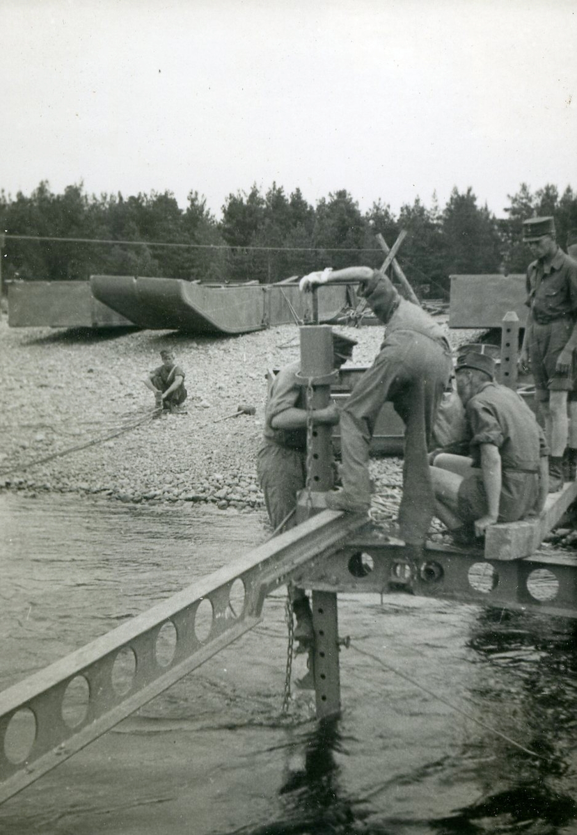 Som korpral på 2.kompaniet, Ing 1, sommaren 1936. Tung krigsbro vid Sand. Höjning av bock med domkraft.
