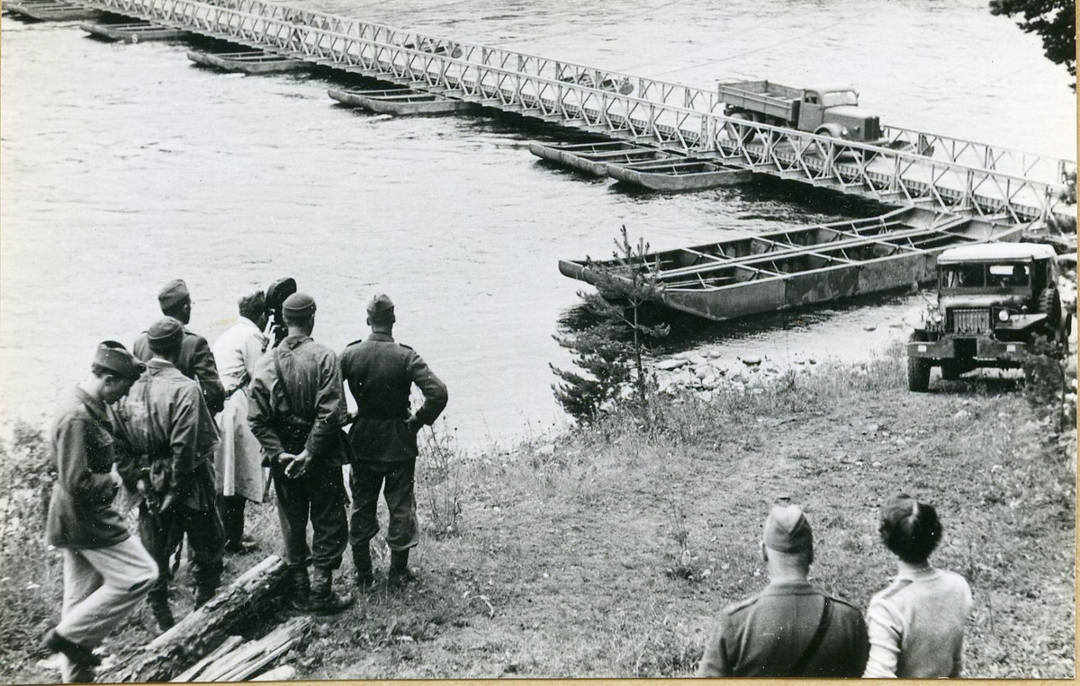 Bron (Balkbro 2 enkel-enkel flytande) är nu slagen över älven och beundras vederbörligen av löjtnant Lohréng och husmor fröken Fastberg, sedan det första fordonet tagit sig över.