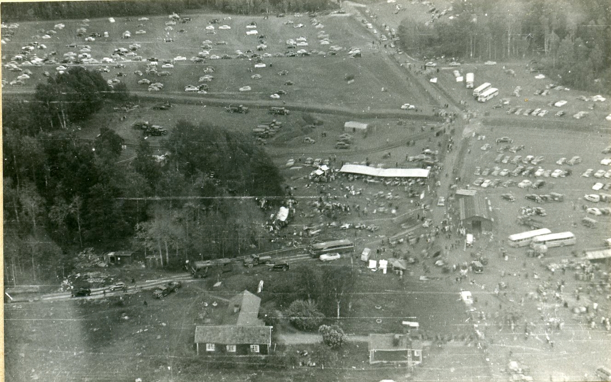 Trakten kring Fäboda terrängrittdagen var trots regnet ett enda myller av folk och bilar. Bilden är tagen från den till förfogande ställda helikoptern (men är ej godkänd av Försvarsstaben).