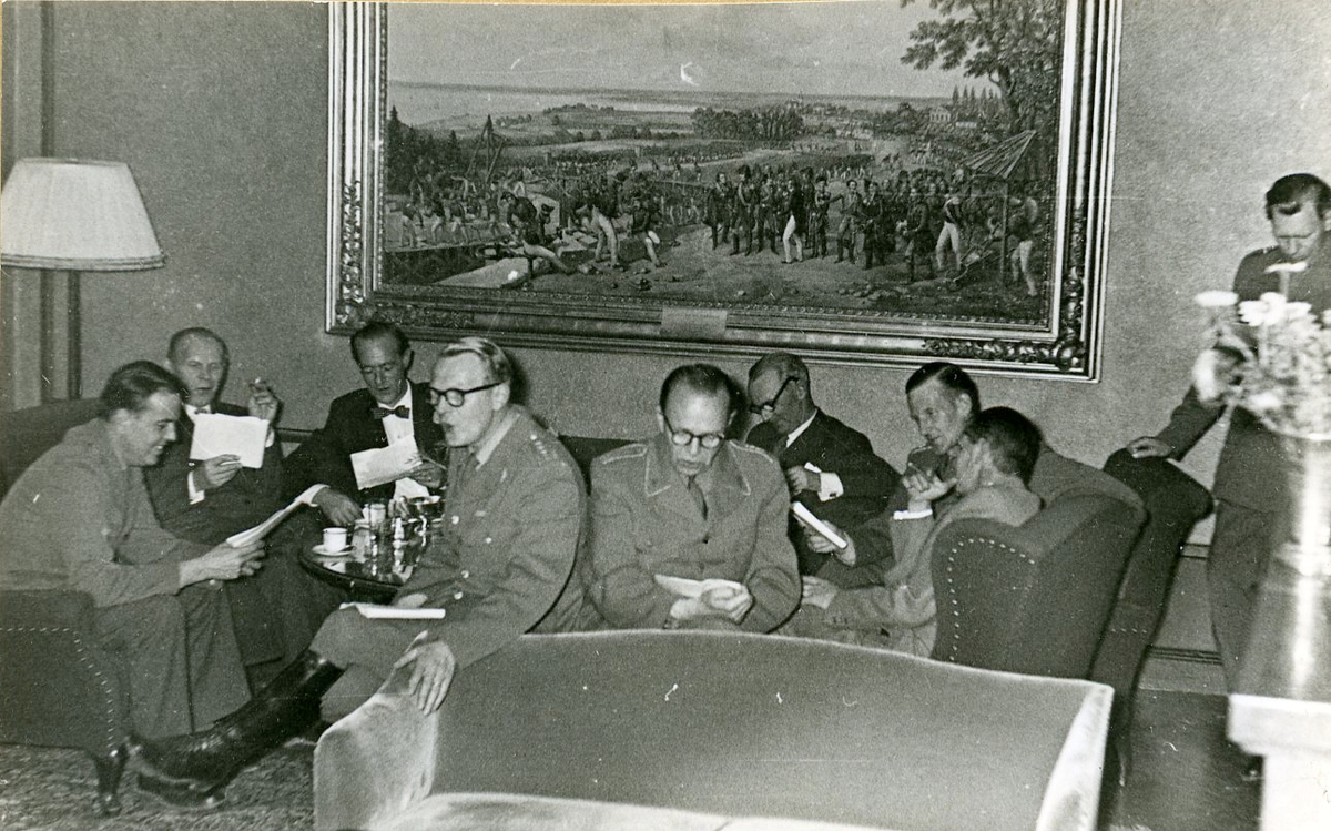 Avskedsmiddag i sept 1956 för doktorn, kapten Hollström och löjtnant Berg. Fr v kapten Hollström, major Bodin, major Gordh, kapten Fredholm, kapten Berthel, överste Welin, major Grape, major Montgomery, kapten Aldurén.