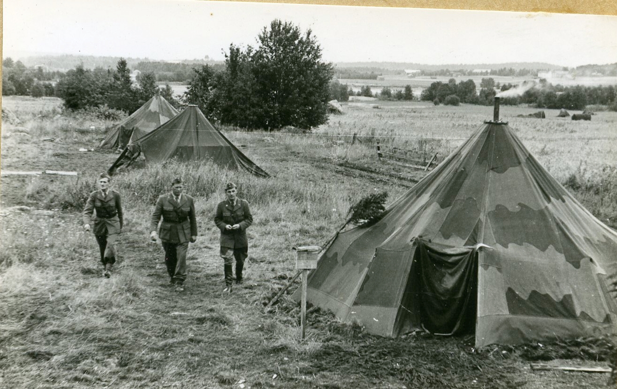 Fänrik Salme, kapten Malmquist och löjtnant Öster vid förläggningen i Hälsingtuna, där det var vackert men vått.