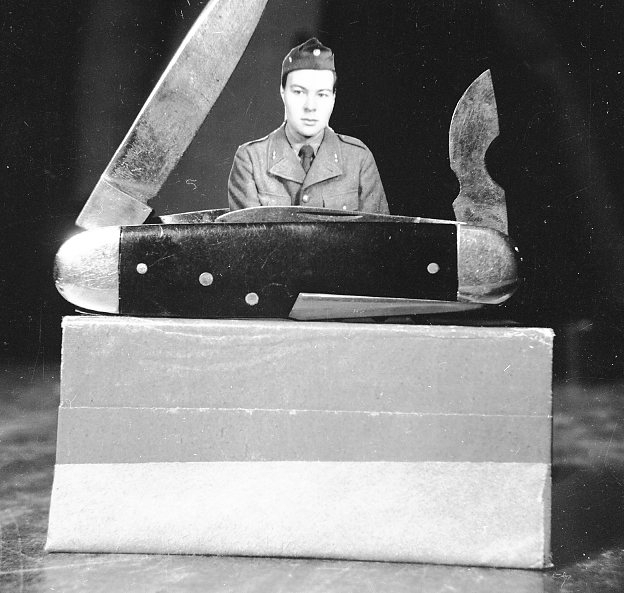 Fotomontage. Trickfoto. Fällkniv och soldat.