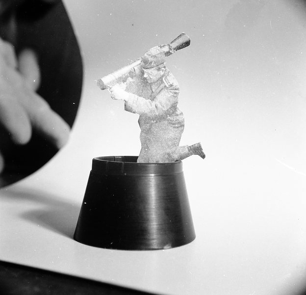 Fotomontage. Trickfoto. Soldat med grg som står i ett objektskydd.