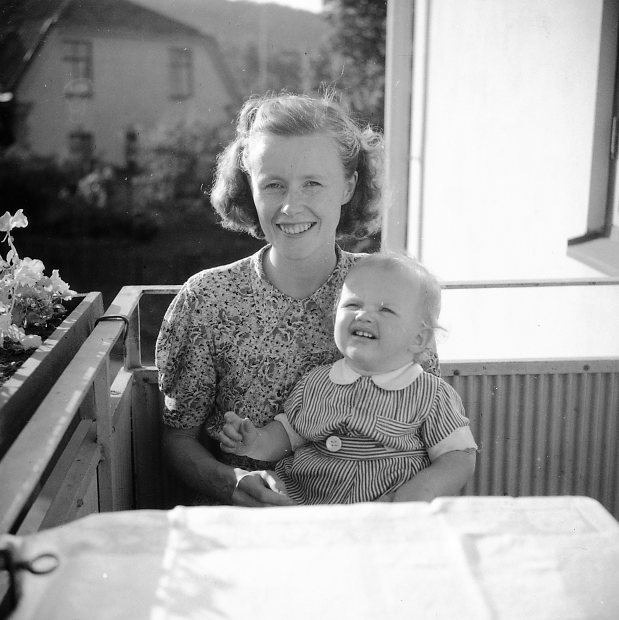 Kvinna med barn på en balkong.