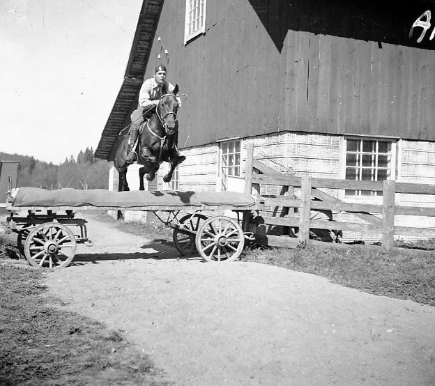 Hästhoppning. Fältritt. Ekipage som hoppar över en vagn.