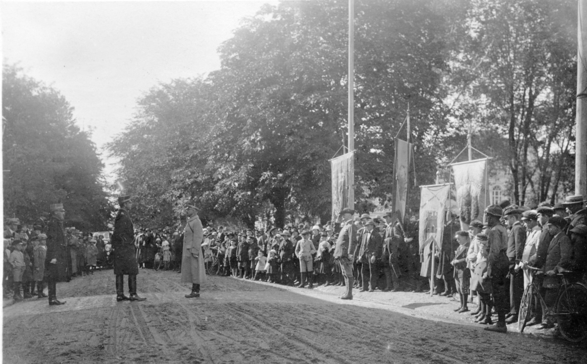 Riksskyttetävlingen i Jönköping, Rådhusparken. Skyttarna avlämnas till HKH Kronprins Gustav- Adolf framför residenset.