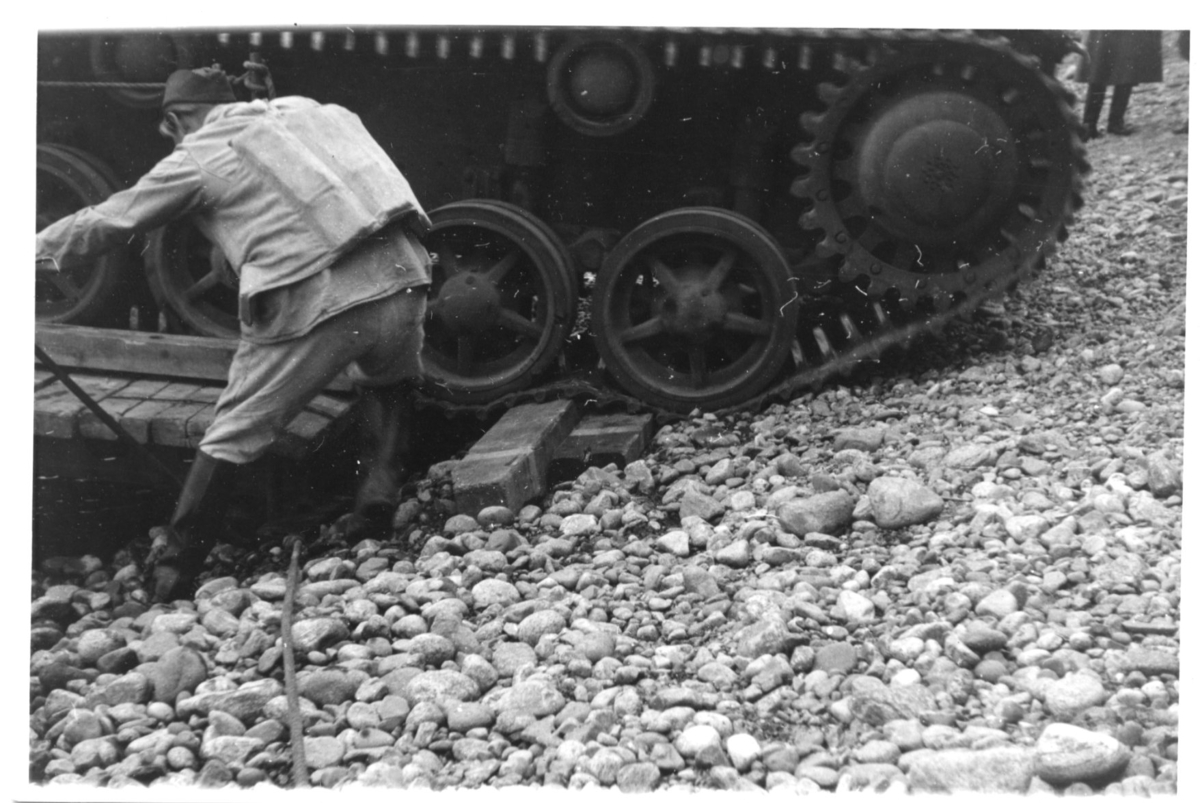 Titel: Maskinell utrustning. Lastning av stridsvagn m/42 från 25 tons stridsvagnsfärja av potonbro materiel.
