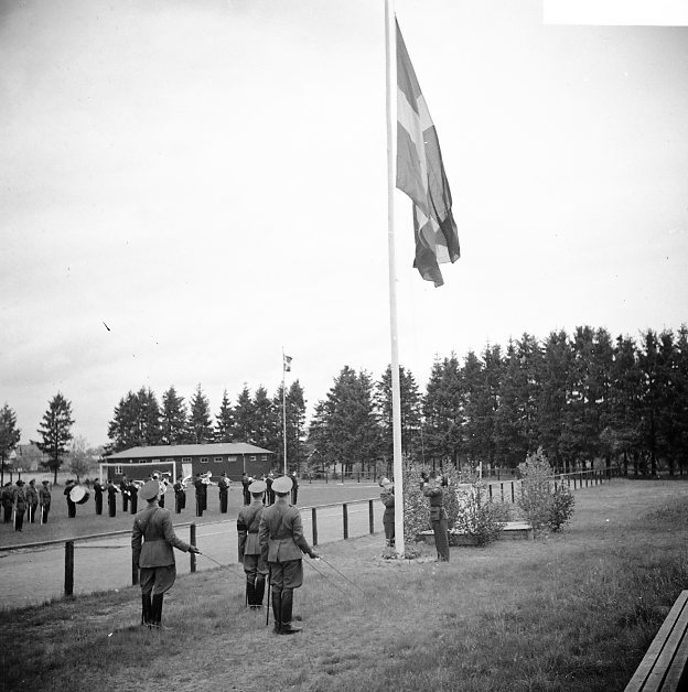 Inmarsch på Rocksjövallen. Svenska Flaggans Dag. Flaggan hissas.