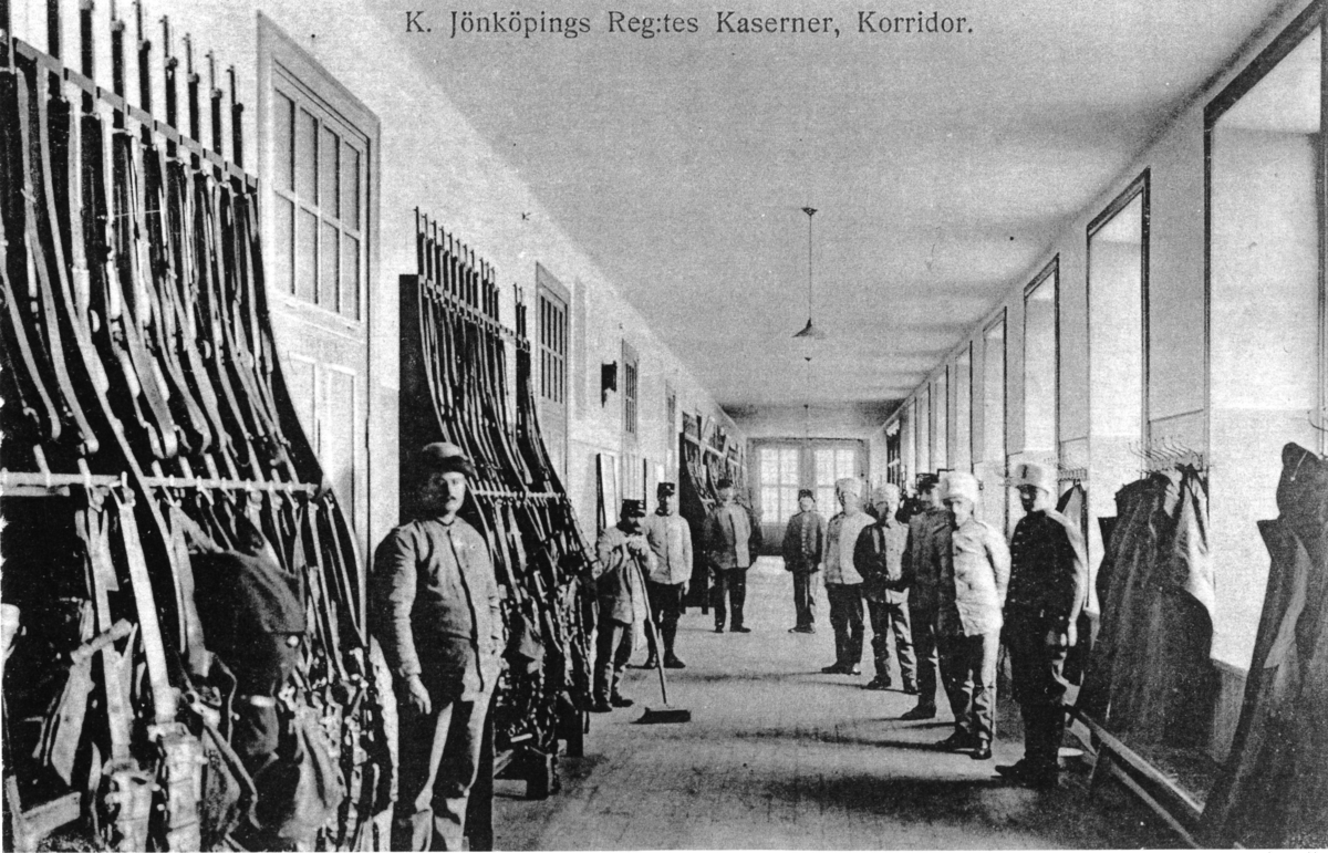 Titel: K. Jönköpings Reg:tes Kaserner. Interiör från kompanikorridor. (fotokopia)