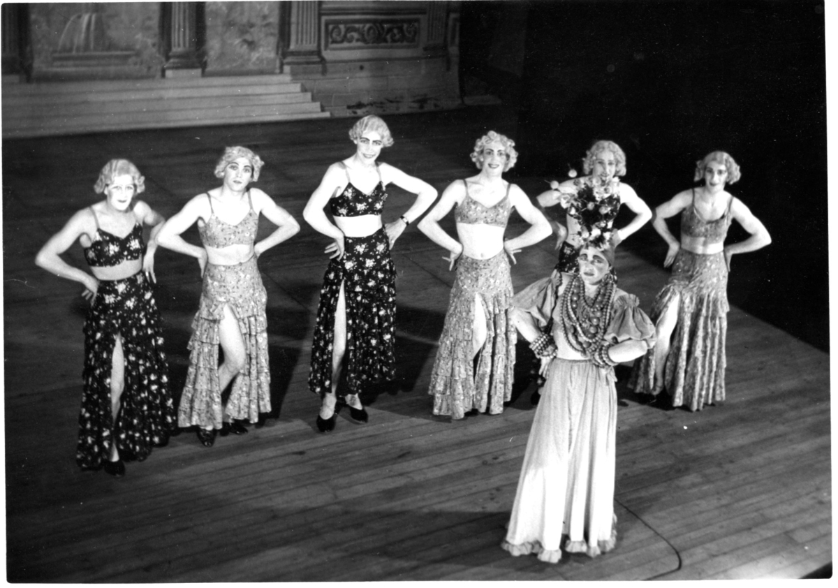 Titel: Revy på A 6. Sju man utklädda till kvinnor.