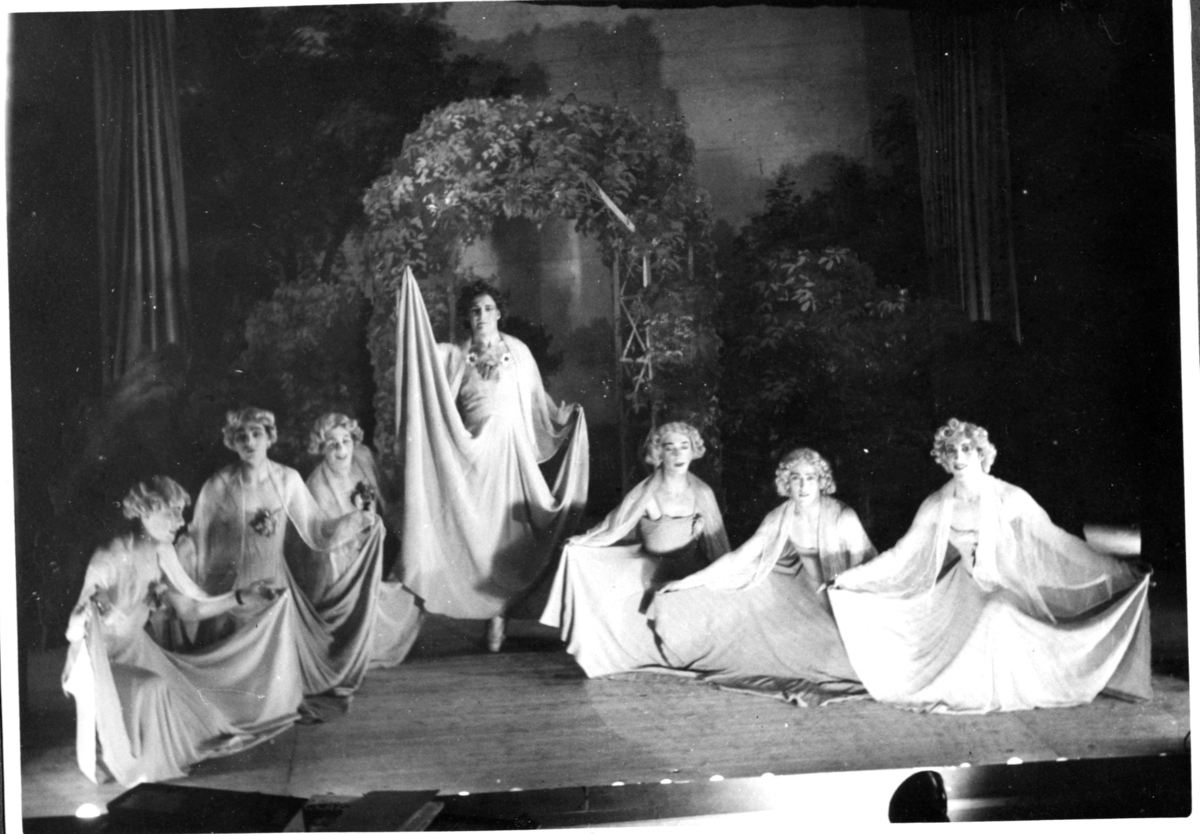 Titel: Revy på A 6. Sju man utklädda till kvinnor.