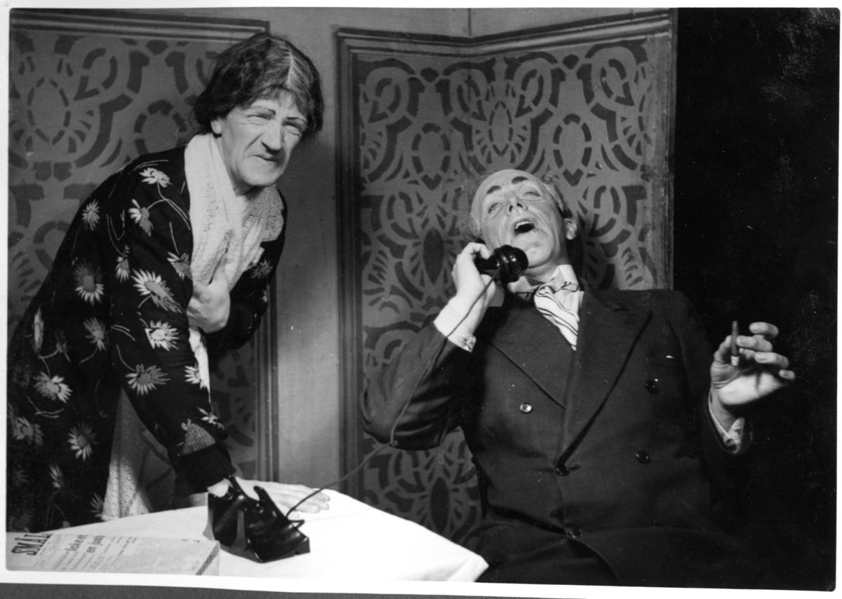 Revy på A 6. Två man, varav en utklädd till kvinna.