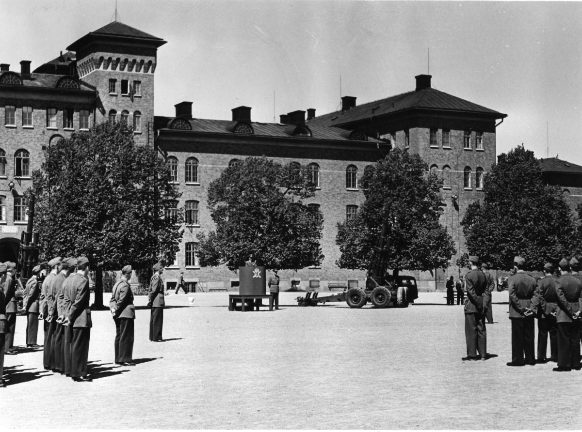Mottagning på kaserngården, A6. Överste Lundqvist, major Ahlström.